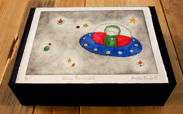 For you all who unfortunately couldn't come to the premiere of „Kleines Raumschiff“ („Little Spaceship“). You can find the Movie now on my website, here. Quick reminder: with only one copperplate, I create a stop-motion-drypiont-movie. The movie is accentuate by the same name song, of Henning. You can buy every unique drypoint only once in my shop, here. I come up with something special! You can also buy my „artist proof“ from „Kleines Raumschiff“. That's all drypoints of the movie (altogether 76 pieces) in a really nice graphic box and the original copperplate of the movie. Interested? Please klick, here.